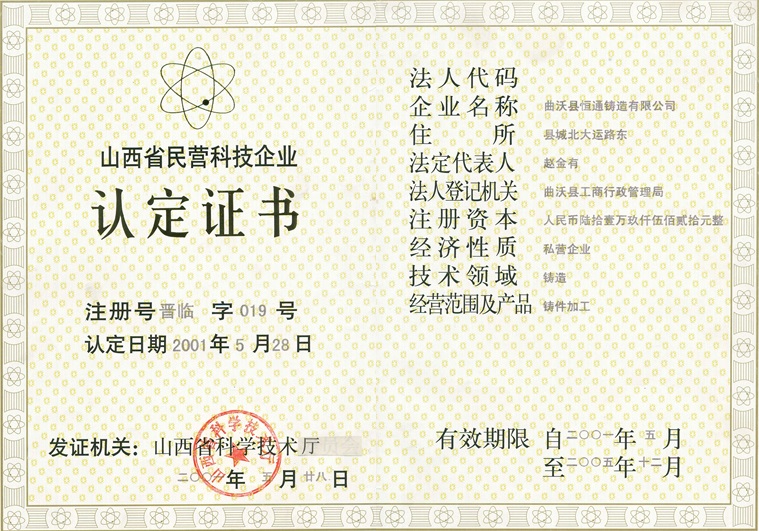 山西省民營科技企業認定證書
